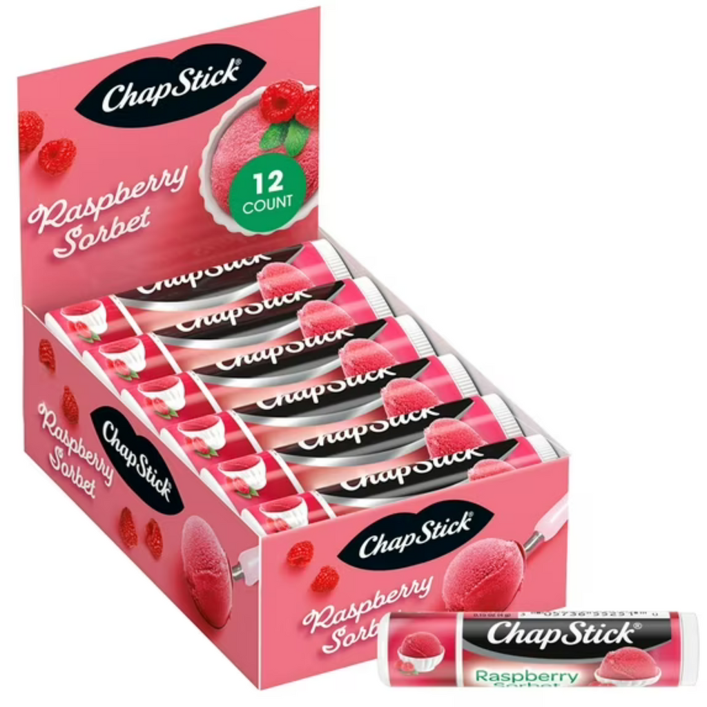 - CHAPSTICK FAN FAVORITE: Stock up on 12 tubes of ChapStick Raspberry Sorbet, a lightly tinted and flavored lip balm that combines function and refreshing flavor.