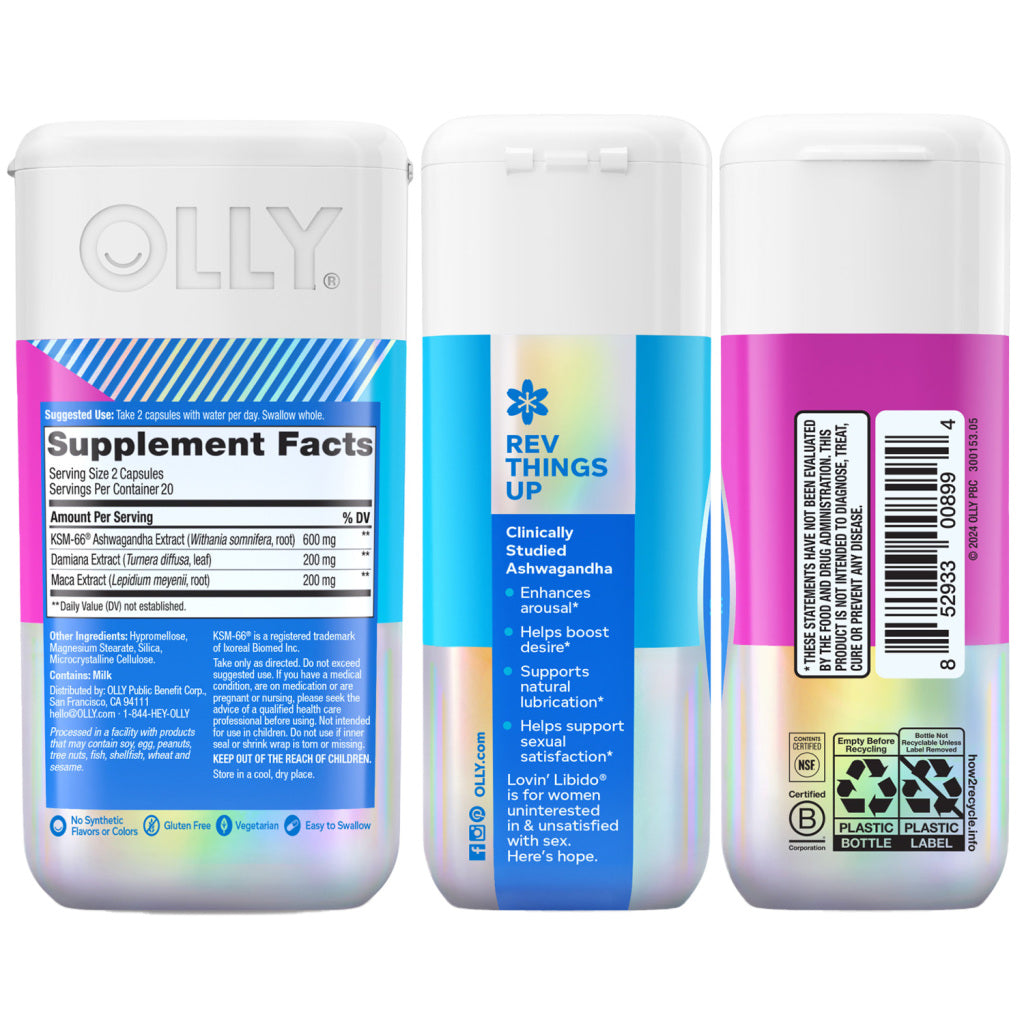 OLLY Woman’s Supplements Variety 3-Pack Support your self-care with science-backed supplements. These OLLY favorites have women’s overall wellness, libido, and hoo-ha needs covered. ● OLLY Ultra Strength Women’s Multi + Omega-3 Softgels, 60 Ct – These softgels deliver the key nutrients you need to help fill in the gaps when eating habits are less than perfect.* The goods inside: Vitamin B12 is key for the production of cellular energy and Omega-3 Fatty Acids help support your brain & heart. Vitamin C & Zinc help support immune system function and Biotin supports healthy hair, skin & nails.* ● OLLY Lovin’ Libido Capsules, 40 Ct – This female libido enhancement supplement is formulated with Ashwagandha, Damiana and Maca. Clinically studied Ashwagandha helps enhance arousal, boost desire and helps support natural lubrication & sexual satisfaction for women.* Plus, it has botanical extracts Damiana and Maca that have been used for centuries. Note: capsule colors may vary due to supply. ● OLLY Happy Hoo-Ha, 25 Ct – This blend of probiotics delivers a clinically-studied dose to ensure a healthy balance of good bacteria and vaginal pH levels. Just the thing for shame free self-care. This probiotic for feminine health supports a healthy vaginal microbiome with a clinically-studied dose of probiotic