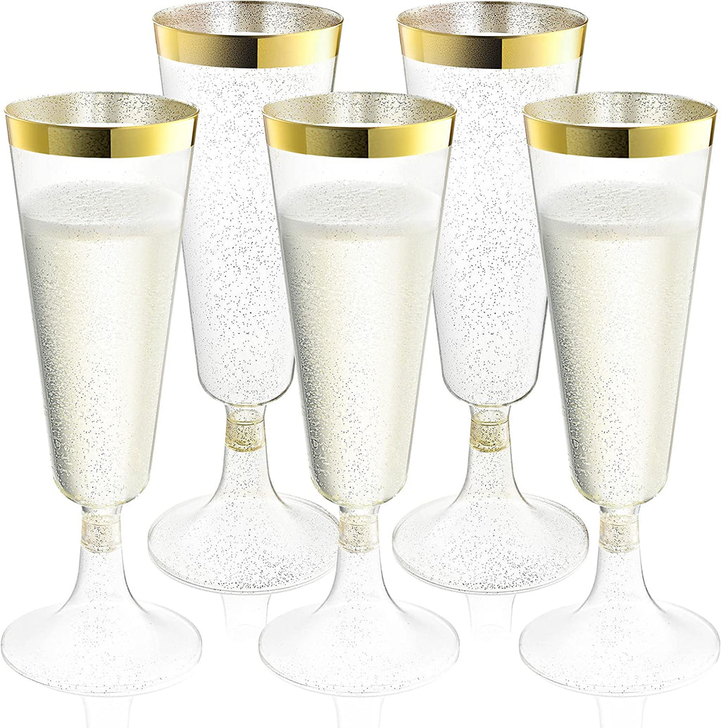 Plastic Champagne Flutes Disposable - Gold Glitter with a Gold Rim - [1 Box of 48] 4.5 Oz Premium Toasting Flutes, Elegant Stylish Mimosa Glasses for Weddings Anniversaries and Catered Events
