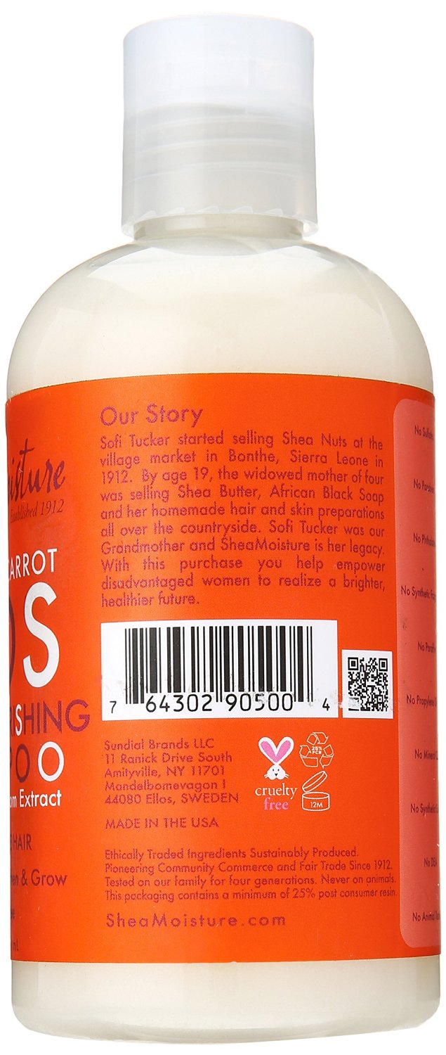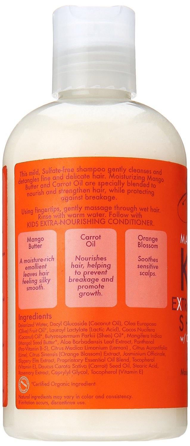 SheaMoisture's Mango & Carrot Extra-Nourishing Shampoo gently cleanses and detangles children's fine and delicate hair. Helps nourish and strengthen hair, while protecting against breakage. Sulfate-free.